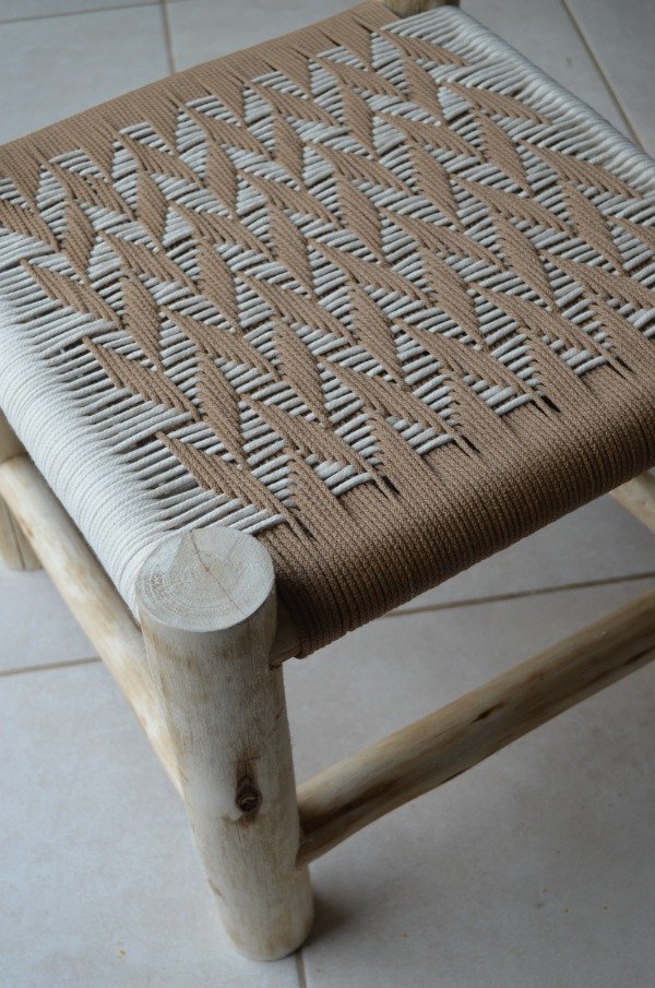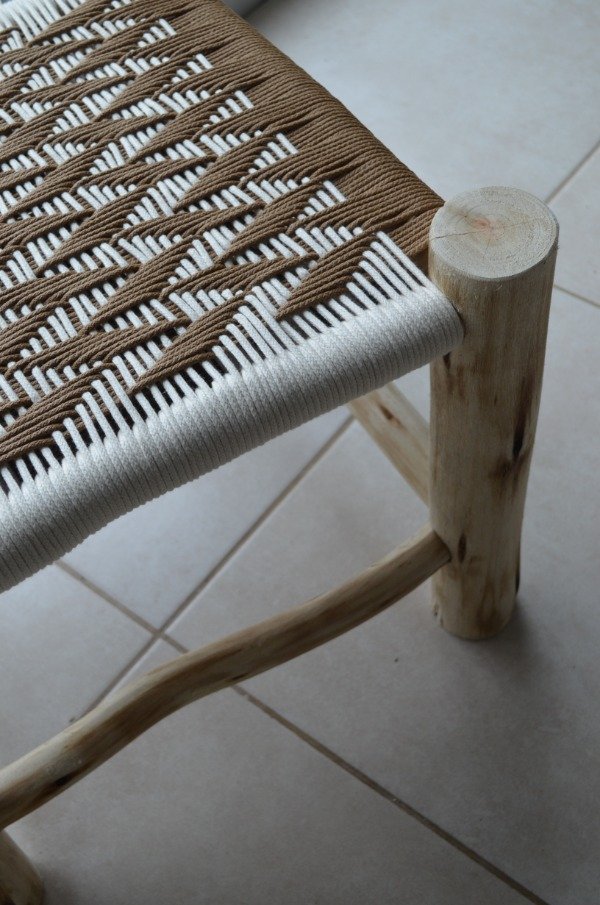 Banco matero con diseño espiga, confeccionado con un encordado entrelazado combinado con cordon de polipropileno marron y cordon de algodon blanco.