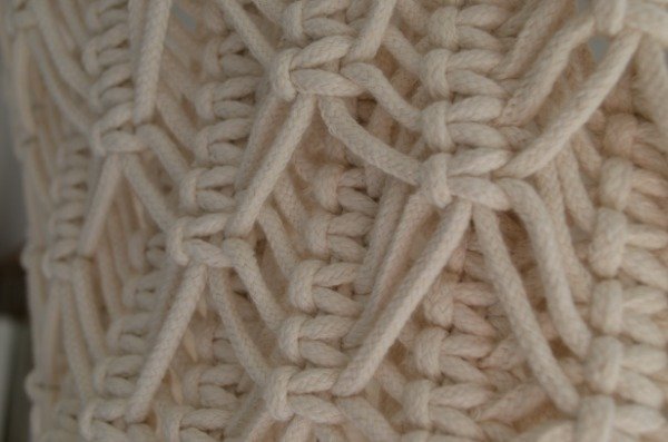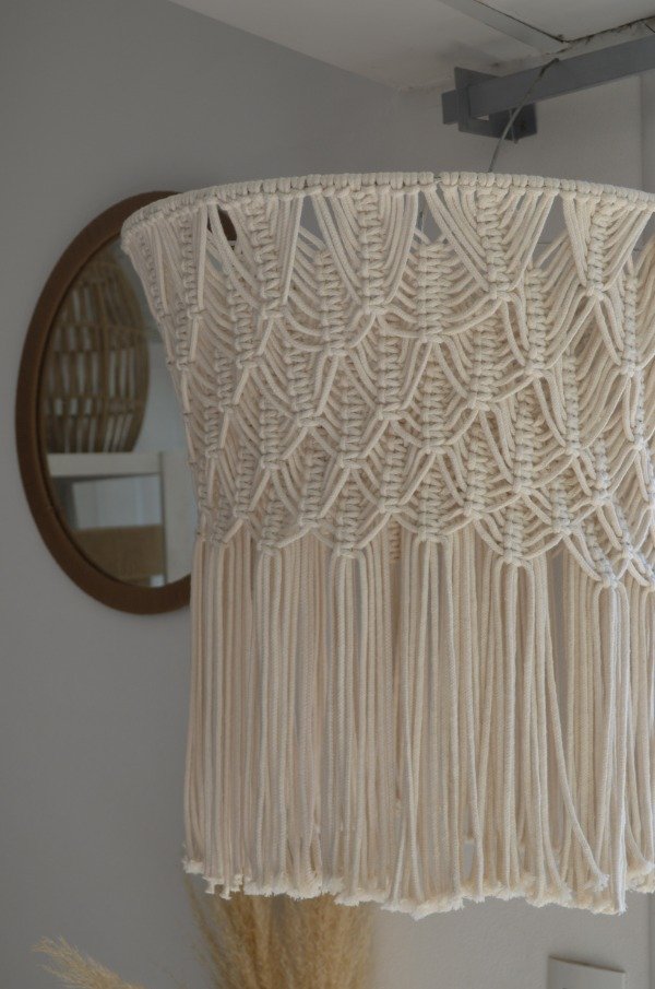 Lámpara en macramé con diseño espiga confeccionada con cordon de algodon blanco.